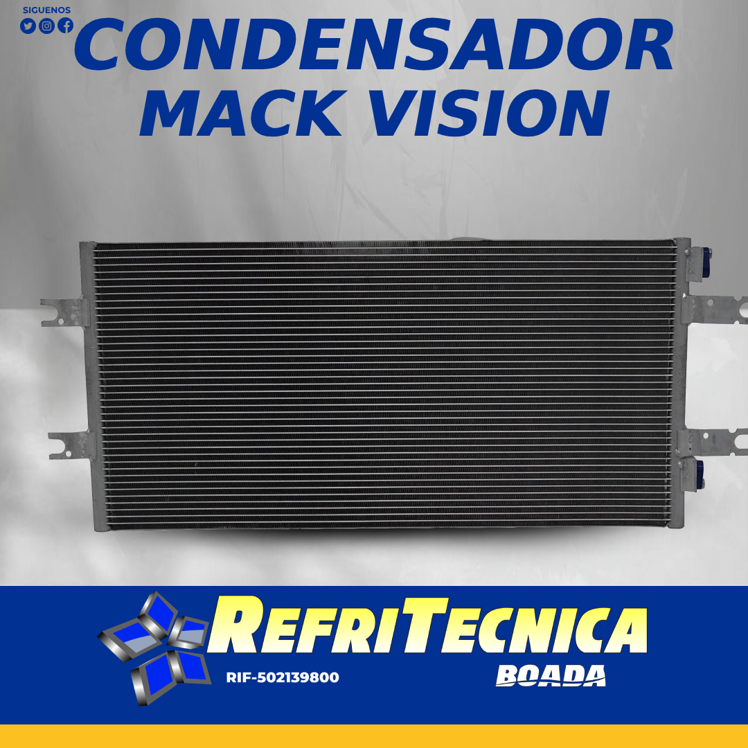 Es el radiador del aire acondicionado de un camión Mack Vision su función es disipar el calor del refrigerante, convirtiéndolo de gas a líquido para que el sistema pueda enfriar la cabina. Se ubica frente al radiador del motor para recibir el aire exterior. Refritecnica Boada