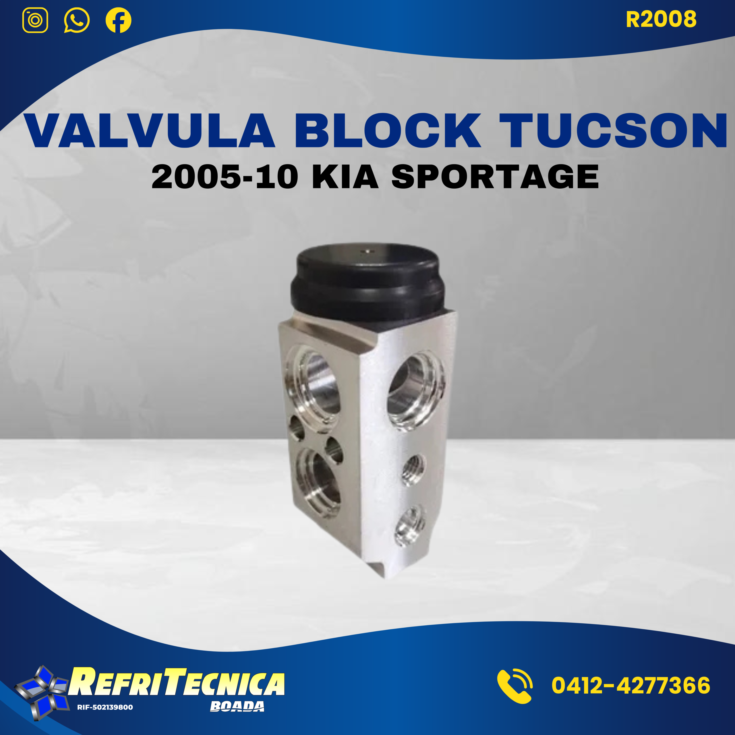 Es el componente que regula el flujo de refrigerante hacia el evaporador. Su diseño tipo block es específico para controlar la temperatura y presión en la Hyundai Tucson y Kia Sportage (2005-2010). Refritecnica Boada